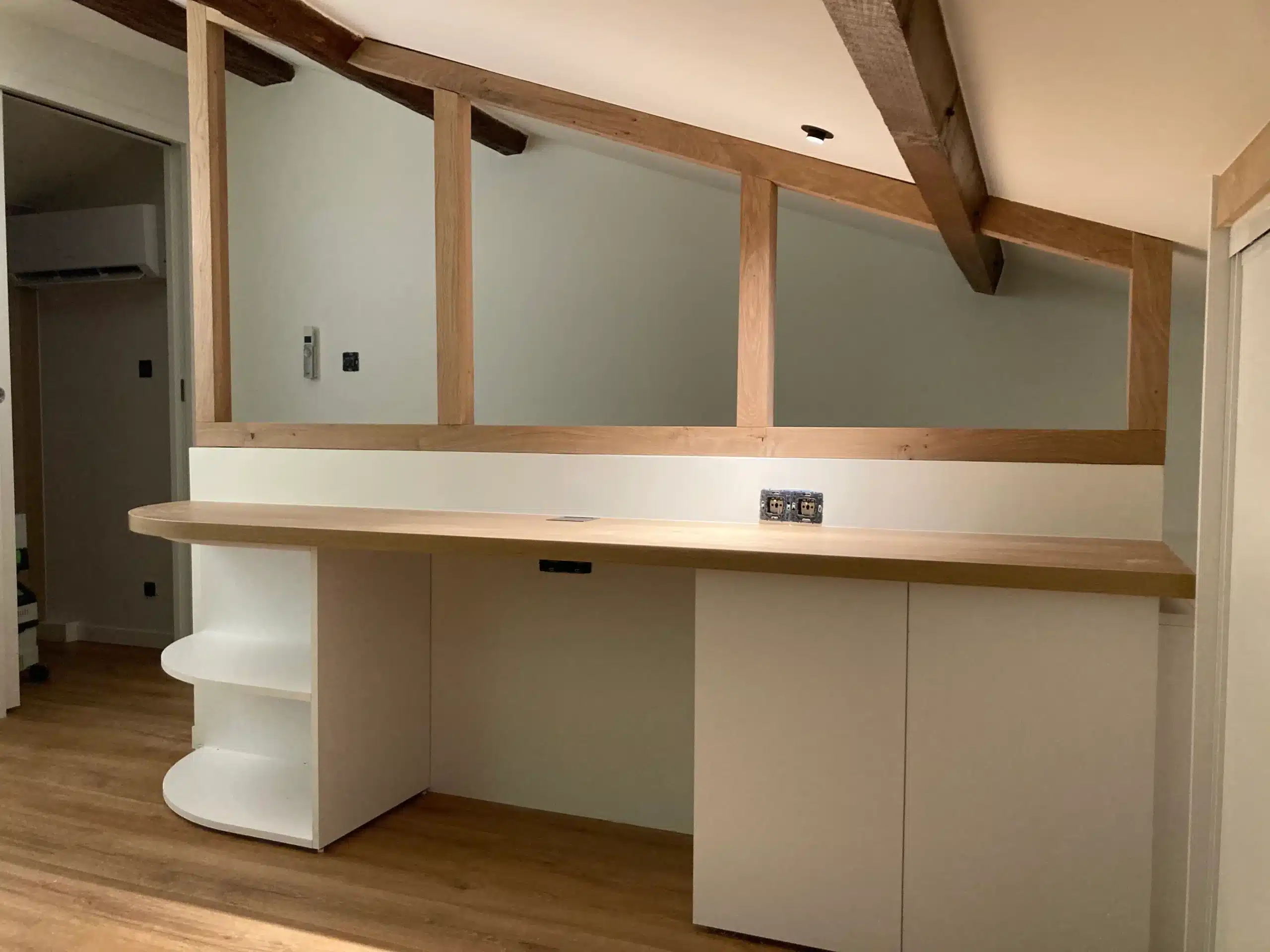 Notre mission : créer un cadre de travail agréable et performant, en phase avec l’image de votre entreprise. Nous intervenons pour l’agencement de bureaux, espaces d’accueil, salles de réunion, showrooms ou commerces, en intégrant des éléments pratiques (rangements, cloisons, mobilier spécifique) et une cohérence visuelle en lien avec votre activité.
