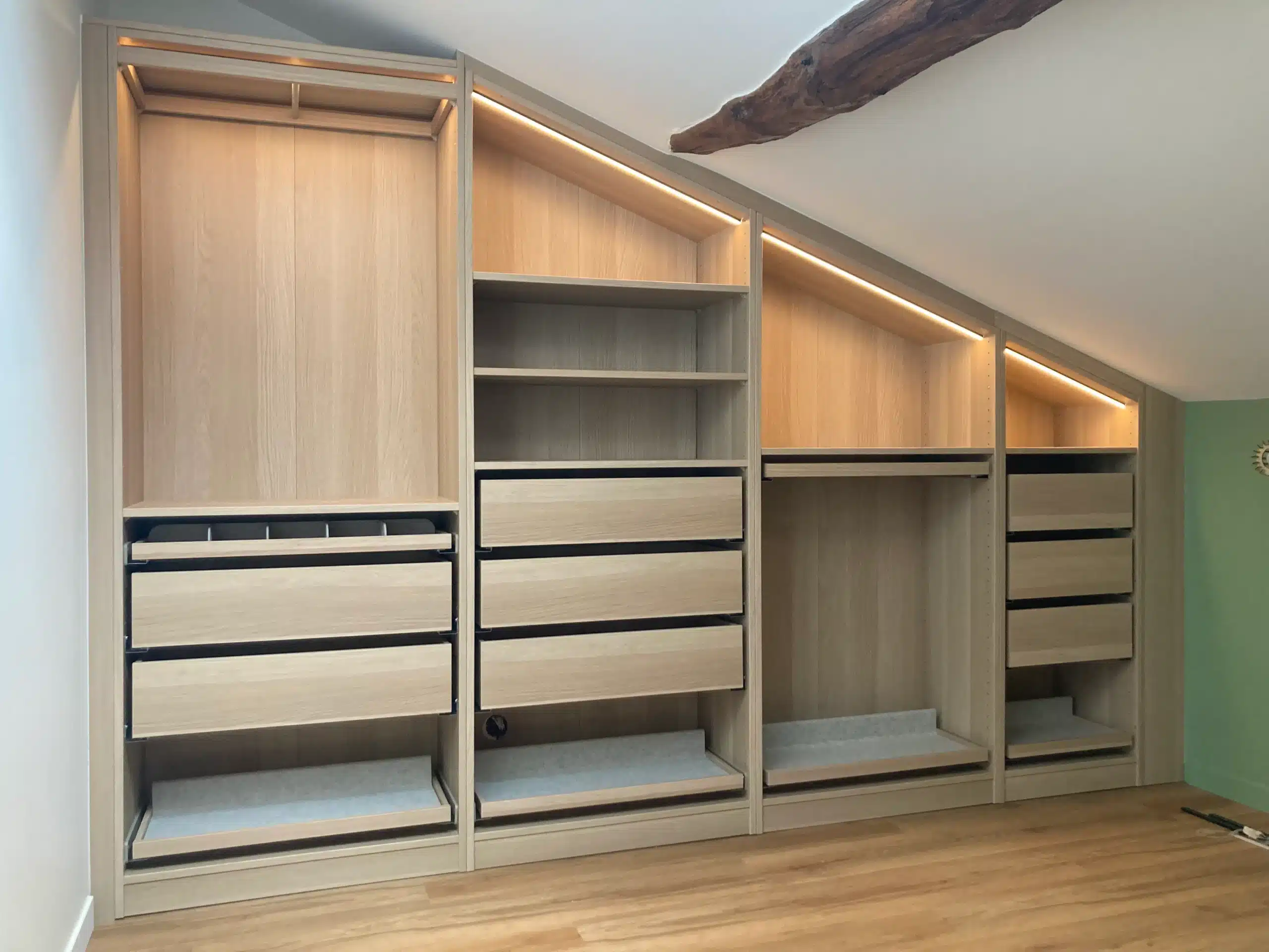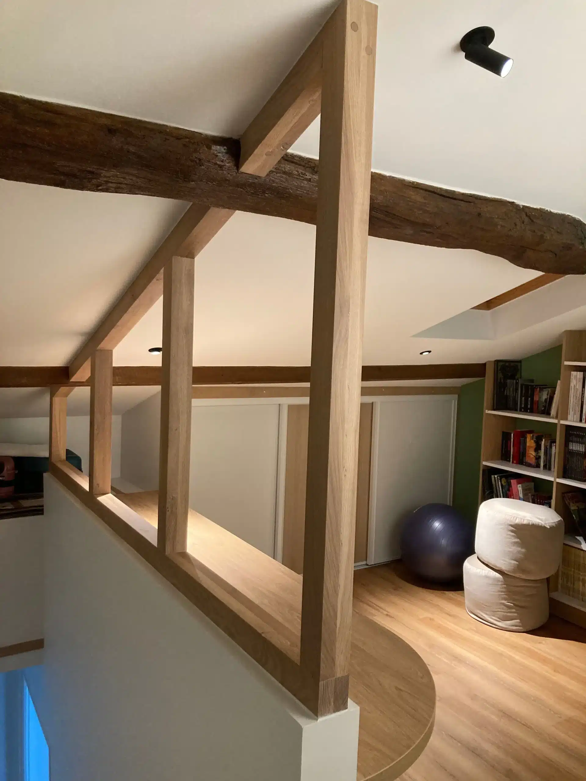 Nous sommes intervenu chez ce client pour repenser entièrement plusieurs espaces de vie : meuble TV, bureau, bibliothèque, dressing, garde-corps et placards ont été conçus et posés sur mesure. Le résultat ? Un intérieur harmonieux, parfaitement adapté aux volumes de la maison et aux besoins du quotidien.